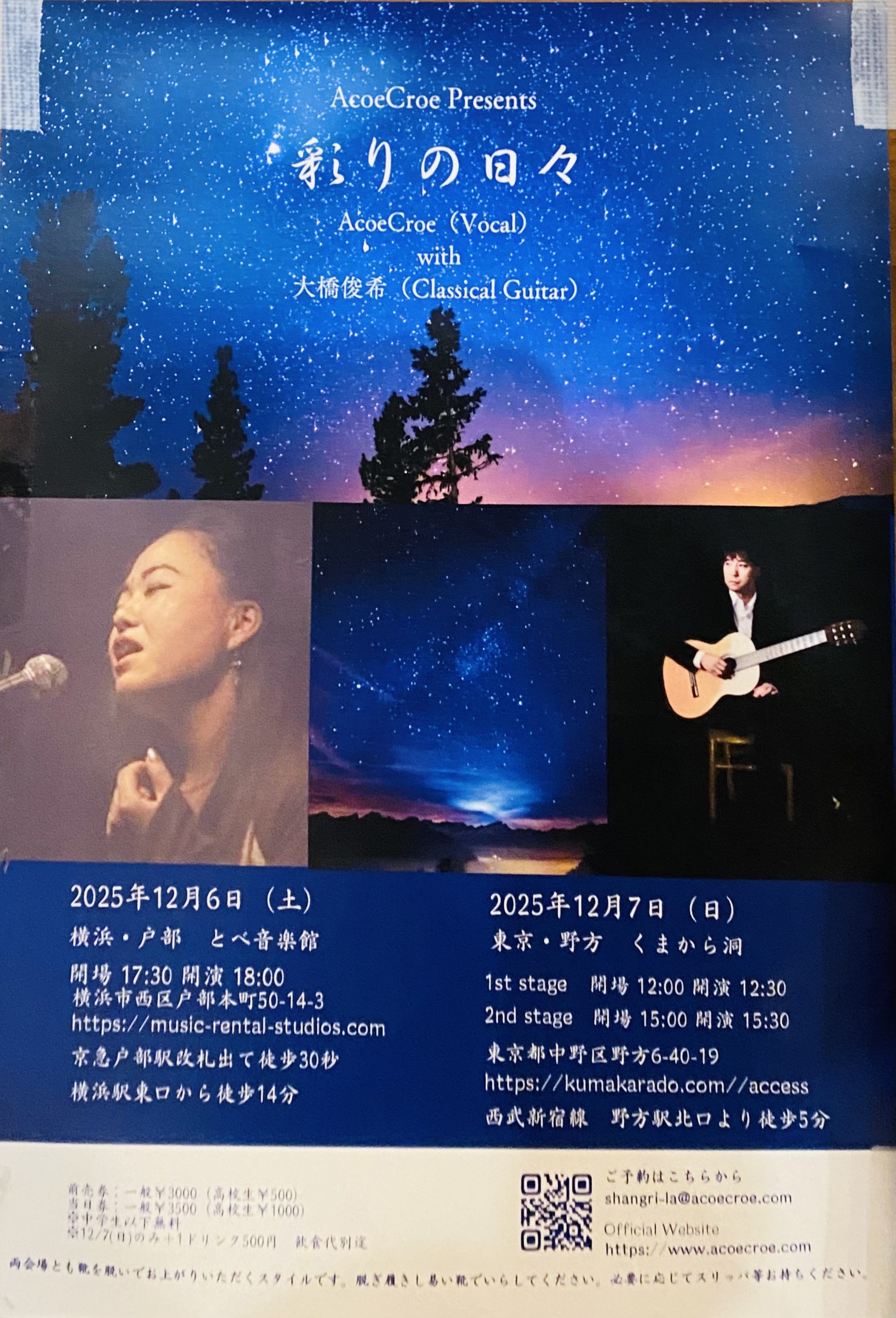 2025年11月15日 / 最終更新日時 : 2025年11月15日 atakeuchi イベント 2025.11.15 12/7(日)はAcoeCroeコンサートくまから洞2回目登場AcoeCroeコンサートクラシックギターの音色にボーカルが乗り穏やかで豊かな時間が流れます。 FacebookXBlueskyHatenaCopy